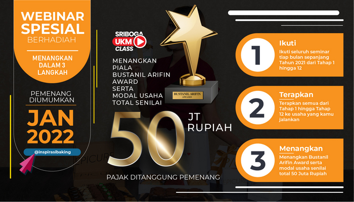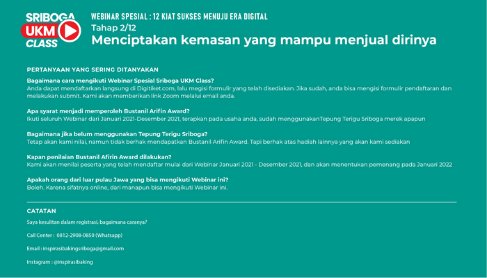 Ayo, ajak teman-temanmu, ikuti seminarnya bersama Sriboga Flour Mill dan sribu.com. Ikuti terus juga seluruh seminar hingga akhir tahun, dan terapkan. Siapa tau kamu jadi pemenang UMKM dengan hadiah puluhan juta rupiah dari kami.