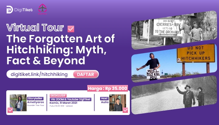Yuk cari tahu mengenai budaya hitchhiking ini dengan mengikuti Virtual Tour the Forgotten Art of Hitchhiking: Myth, Fact, & Beyond. Dipandu oleh storyteller @ameliyaros dari Trex Tour yang akan membahas mengenai apa itu hitchhiking, apakah hitchhiking itu illegal, bagaimana keadaan hitchhiking di abad 21, serta asal usul sejarah hitchhiking, mitos, dan tips hitchhiking untuk pemula.