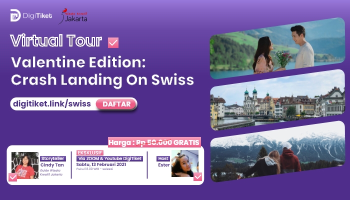 Yuk gabung virtual tour rute Explore SWISS yang akan dipandu oleh Cindy Tan @cherie.the.explorer dari Wisata Kreatif Jakarta. Nantinya, sobat akan mengunjungi beragam destinasi wisata menarik di beberapa kota di Swiss seperti Interlaken, Sigriswil, Grindelwald, Iseltwald, Zurich, dan berbagai spot ikonik yang ada di drama seri korea fenomenal "Crash Landing on You".